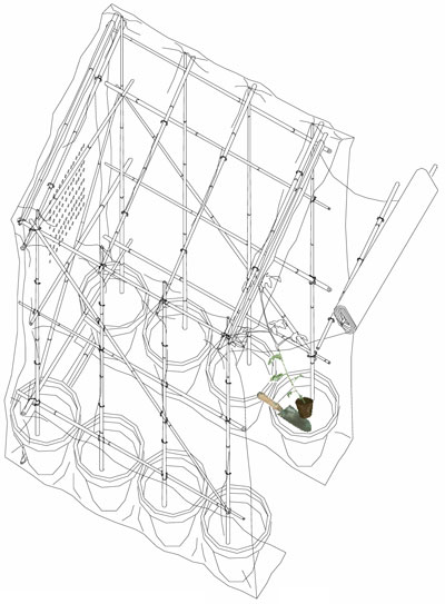 door. To allow for ventilation, pierce a sequence of 10mm holes through all facades at high and low level. For a tomato-house prototype finally plant out tomato plants within each pot, ‘firm in’, and water well.